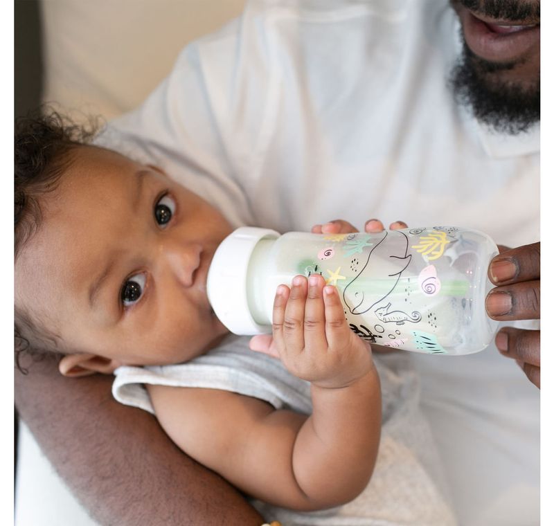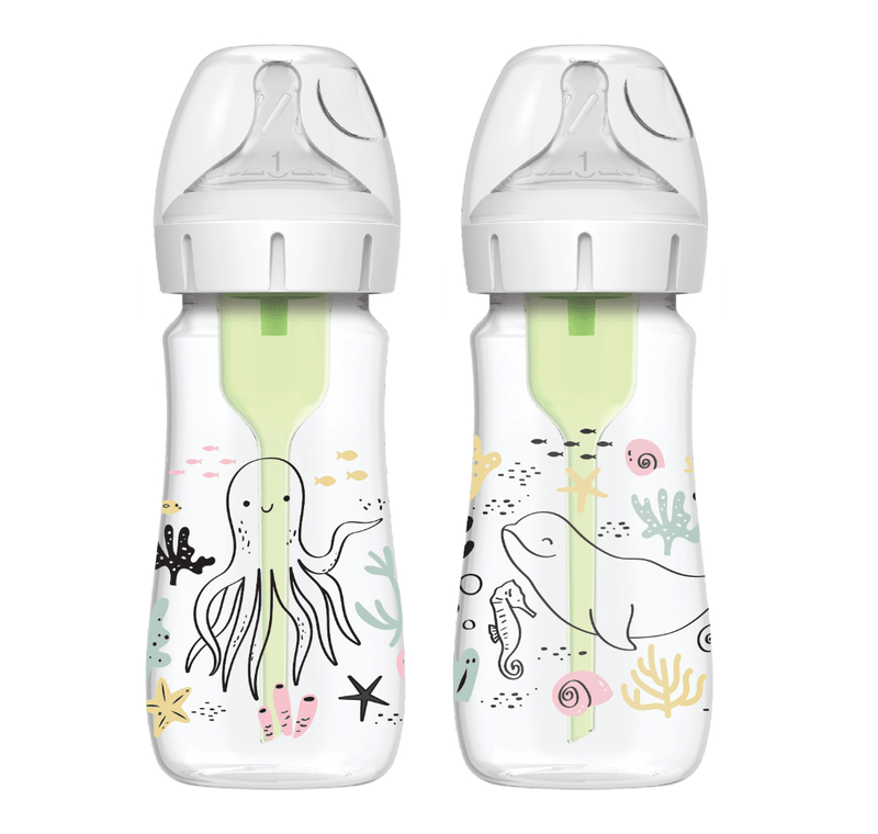 Tus opciones nunca han sido mejores que con el biberón de cuello ancho Anti-Colic Options+™ de Dr. Brown's Natural Flow®, ahora en una presentación estampada con divertidos dibujos infantiles pero conservando su sistema de ventilación interna anticólicos que está clínicamente probado para reducir los cólicos. Con capacidad para 9 onzas, cada tetero cuenta con su sistema de ventilación y está estampado con un divertido motivo del océano con toques de lindos colores.