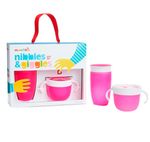 Set de bowl para snacks y vaso miracle, perfecto para el hogar, la guardería o el uso en movimiento.. Dos elemetos esenciales para mantener el orden en el hogar, en el carro o donde sea. El bowl para snacks con solapas de silicona suaves para las manos pequeñas mantienen cada miga contenida evitando derrames de comida por todas partes, cuenta con dos asas diseñadas para que incluso las manos más pequeñas las puedan agarrar fácilmente. El vaso miracle 360º es además ideal para que los niños pueden tomar sin preocuparse por derramar el liquido y vayan cogiendo destreza en tomar de un vaso común. Ahora los snacks y las bebidas saldrán solo cuando ellos quieren, la hora de los bocadillos ya no significa comida en todas partes excepto en la boca de su hijo.