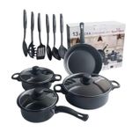 Equipa tu cocina con un completo set de ollas y utensilios en tamaño pequeño ideales para apoyo en todas tus preparaciones. Incluye cacerolas, sartén y olla con tapas y utensilios. Su recubrimiento en aluminio facilita la cocción y su limpieza es rápida y sencilla. Perfecto para uso diario, práctico y duradero para cualquier hogar.