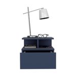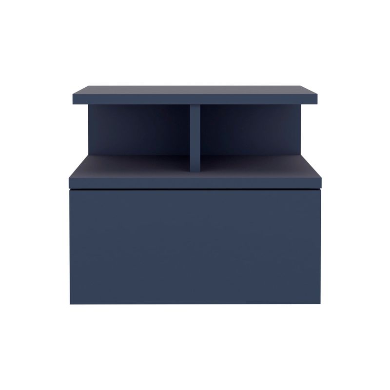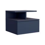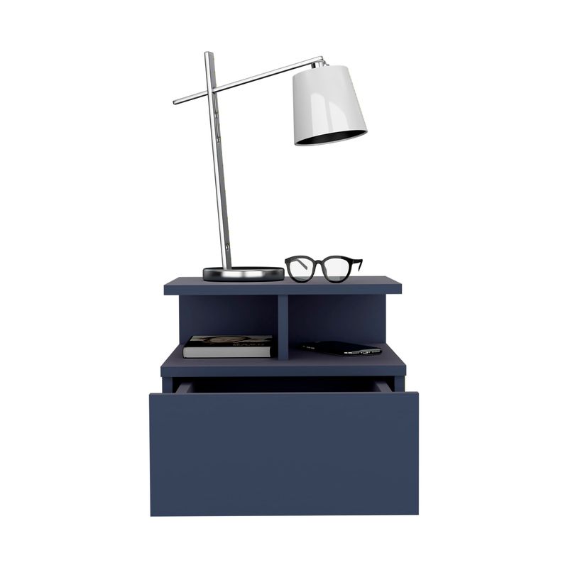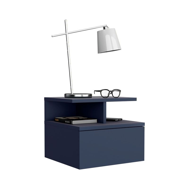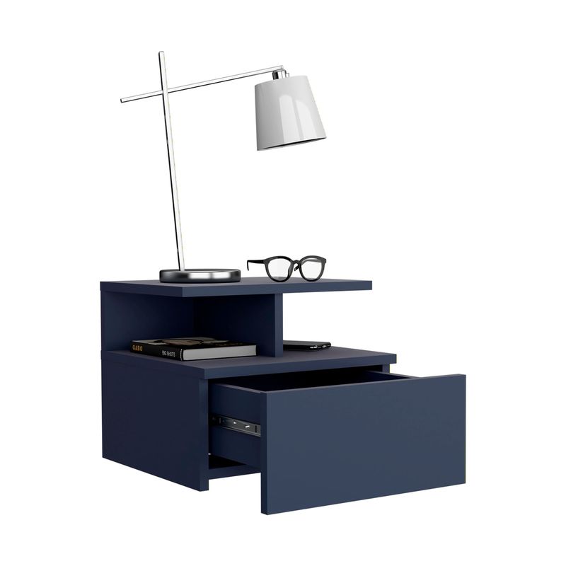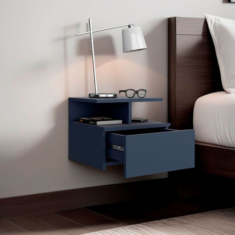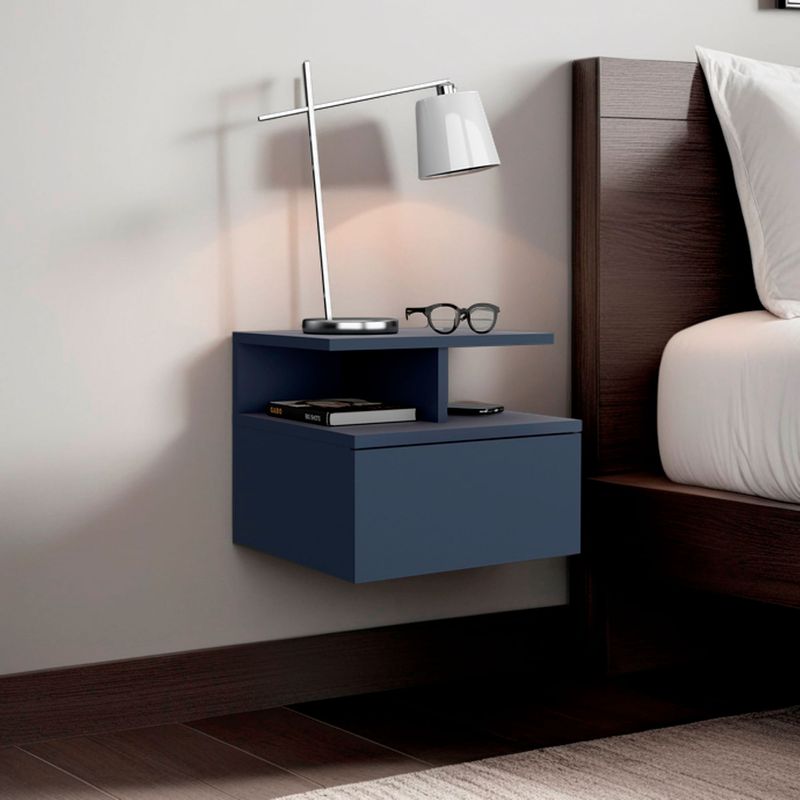 Velador flotando con un cajon y entrapaño aierto para guardar y ubicar objetos, diseño limpio y montaje discreto con medidas de: ALTO 29,5 ANCHO 35,6 FONDO 33,6
